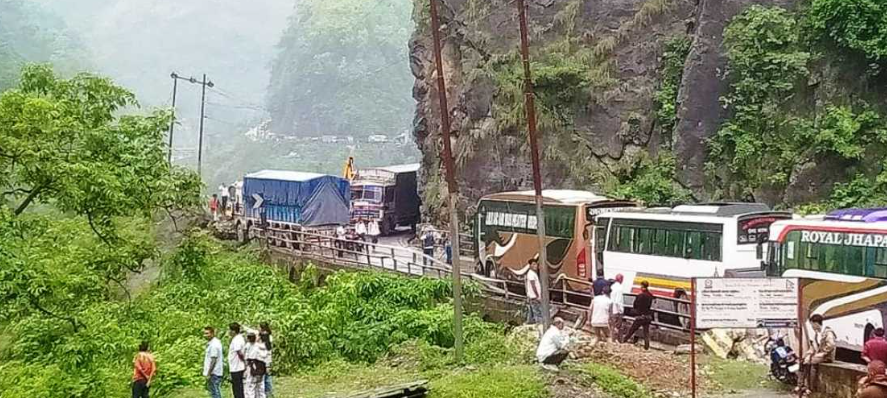 According to the Chitwan District Police Office, last night at 10:55 PM, a dry landslide occurred at Tuin Khola, Ward No. 5 of Ichchhakamana Rural Municipality in Chitwan, completely blocking the road in both directions.
