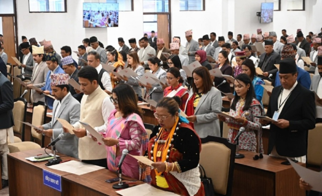 Newly elected members of the House of Representatives have officially taken their oaths of office and secrecy in a ceremony held at the Parliament’s temporary building in Singha Durbar. The solemn event was led by the senior-most member, Arjun Narsingh KC, who administered the oaths. Notably, 63 lawmakers opted to take the oath in their native languages, deviating from the national language, Nepali, as facilitated by the Federal Parliament Secretariat. The lawmakers arrived at the ceremony dressed in their traditional attire, reflecting their cultural backgrounds and identities as they embarked on their legislative roles.